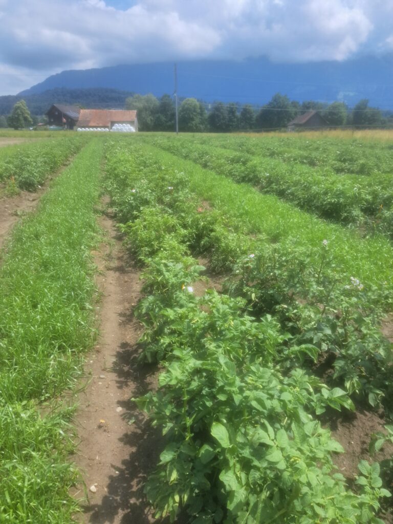 Mit dem erfahrenen Kartoffelanbauer Manfred Baumgartner aus dem Rheintal, wurden zwei unterschiedliche Anbauflächen unter die Lupe genommen. Grundsätzlich zeigte sich der Kartoffelexperte positiv überrascht, wie gesund sich die Kartoffelpflanzen im Vergleich zu vielen Flächen im Rheintal zeigen. Verantwortlich macht er vor allem die kühleren Temperaturen und den stetigeren Wind in der Hanglage, wodurch Pilzkrankheiten gehemmt werden. Doch auch bei den begutachteten Feldern zeigten sich grosse Sortenunterschiede im Kraut- und Knollenfäulebefall. Bei den starken Niederschlagsmengen legte er den Teilnehmenden nahe, den Pflanzenschutz nicht zu vernachlässigen. Ab Niederschlagsmengen von 30mm sei der Schutz bereits weg ist. Eine erfolgreiche Behandlung zeigt sich an den Blättern dann, wenn das befallene Blatt austrocknet und der Pilzrasen nicht mehr schmiert. Neben Phytophthora und Alternaria wurden die Symptome und Handlungsempfehlung einer befallenen Pflanze mit Erwinia, einer bakteriellen Knollenfäulnis, besprochen. Im Unterschied zu den anderen Krankheiten breitet sich diese erst bei der Ernte aus, wenn die befallene Knolle mit dem anderen Erntegut in Berührung kommt. Als weiterer Tipp sollten die Landwirte die Spurenelemente wie Mangan beim Kartoffelanbau mit berücksichtigen, da diese Nährstoffe oft mangelhaft im Boden verfügbar sind. Wir danken herzlich Manfred für den informativen Nachmittag und hoffen alle auf besseres Wetter für eine gute Kartoffelernte 2024.