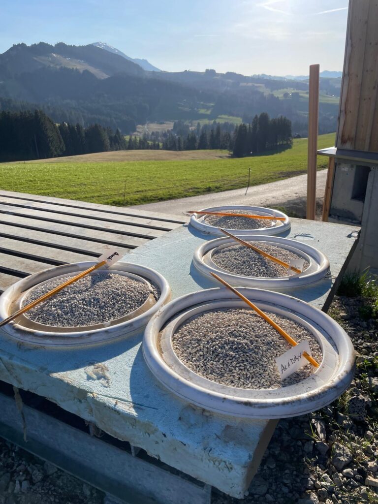 Auf einer Versuchsparzelle bei Familie Knaus in Unterwasser konnten 2022 alle wichtigen Akteure der Forschung und Züchtung der Schweiz vereint werden. Die Versuche wurden durch die ETH Zürich angelegt und werden zusammen mit dem Verein Alpsteinkorn und der Beratungsfirma RhyTOP koordiniert. Die Zusammenarbeit von Züchtung (Agroscope, DSP, GZPK), Forschung (ETH, FIBL) und der Saatgutbranche (UFA Samen) soll helfen, geeignete Sorten und Biobeizmittel zu finden.